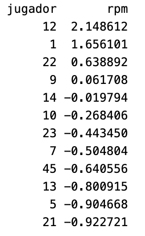 Jugador A: +15 en 25 minutos → 15 / 25 = +0.60 por minuto